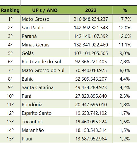 O VBP de Mato Grosso representa 17% do VPB nacional, que totalizou R$ 1,189 trilhão em 2022. Assim, Mato Grosso segue no topo do ranking nacional de produção agropecuária, à frente dos estados de São Paulo (12%), Paraná (11,7%), Minas Gerais (11,1%) e Goiás (9%).