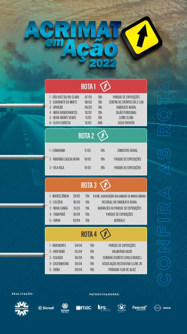 Ao todo, o Acrimat em Ação percorrerá quatro rotas, que compreendem 19 municípios em oito regiões de Mato Grosso. A expectativa é de que 3,5 mil pessoas participem do programa, que se encerrará em 9 de abril. Veja as rotas completas abaixo.
