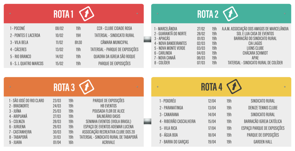A primeira parada será em Marcelândia, no dia 27, às 19h, na Associação dos Amigos de Marcelândia. A última parada será em Colíder, no dia 7 de março, às 19h, no Tatersal do Sindicato Rural do município.