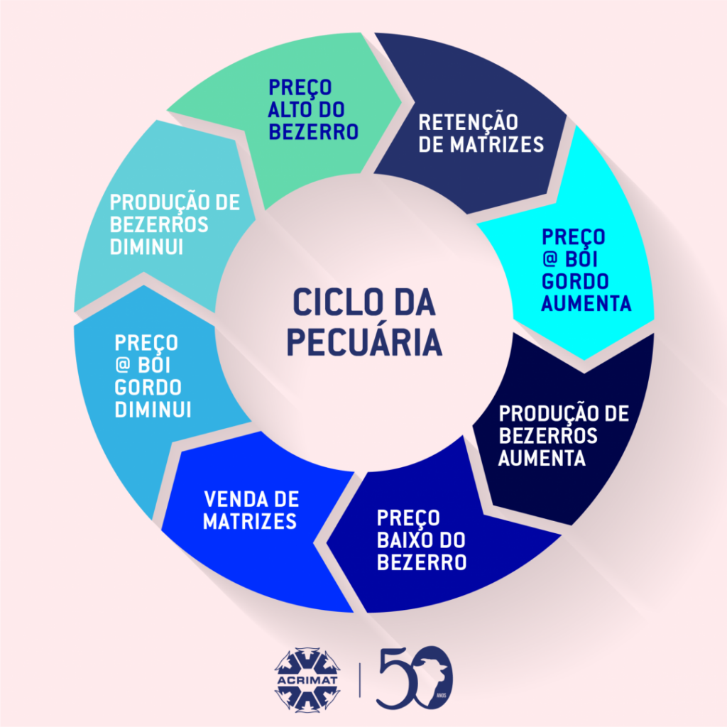 Conhecer o ciclo pecuário é fundamental para orientar o pecuarista na tomada de decisão, permite planejar as ações de compras, o custo de produção, investimentos e os melhores momentos para a venda. Quem comanda esse ciclo é a vaca, o abate e a retenção de fêmeas geram impactos em toda a cadeia pecuária e resultam em épocas de alta e baixa nos preços da arroba.