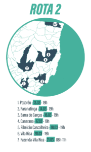 A segunda viagem começa no dia 13 de março, em Poxoréu. Paranatinga (14), Barra do Garças (16), Canarana (17), Ribeirão Cascalheira (18) e Vila Rica (20 e 21) completam a Rota 02.
