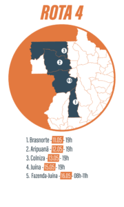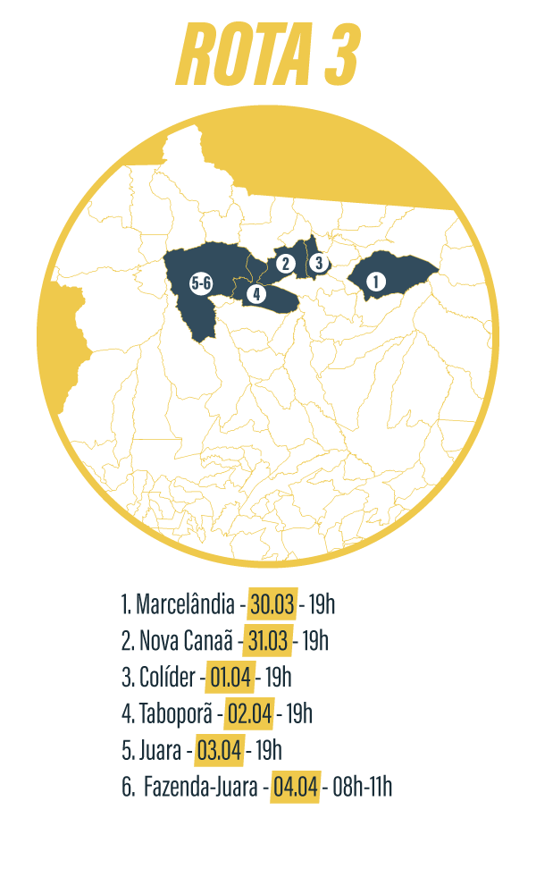 Marcelândia (30.03) é a primeira cidade a receber a Rota 03. Nova Canaã (31.03), Colíder (01.04), Tabaporã (02.04), Juara (03 e 04.04) completam o cronograma. A Rota 04 começa no dia 11 de maio, em Brasnorte. Aripuanã (12.05), Colniza (13.05) e Juína (15 e 16.05) também fazem parte da penúltima rota do Acrimat em Ação.