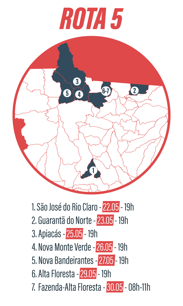 O trabalho, que consiste no levantamento e na coleta de dados realizados pela equipe técnica da Acrimat, captando as necessidades específicas de cada região visitada, chega a sua última parte com a Rota 05. Esta inicia em São José do Rio Claro (22.05), passa por Guarantã do Norte (23.05), Apiacás (25.05), Nova Monte Verde (26.05) e Nova Bandeirantes (27.05), terminando as visitas em Alta Floresta (29 e 30.05).