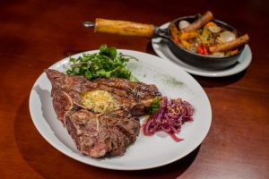 Prato Beef Week: T-bone com manteiga de tutano, geleia de cebola roxa, agrião e legumes assados