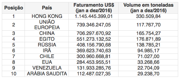 As exportações brasileiras de carne bovina fecharam o ano de 2016 com faturamento de US$ 5,5 bilhões. De janeiro a dezembro, foram embarcadas mais de 1,4 milhão de toneladas. Em comparação com o ano anterior (2015), o volume embarcado teve um aumento de quase 1%. Porém, o faturamento registrou uma retração de 7%.