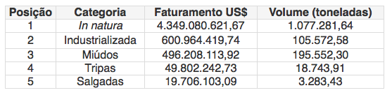 Em 2016, dentre as categorias de carne exportadas pela indústria brasileira, a in natura liderou as vendas, totalizando um faturamento de US$ 4,3 bilhões e 1,1 milhão de toneladas embarcadas de janeiro a dezembro.