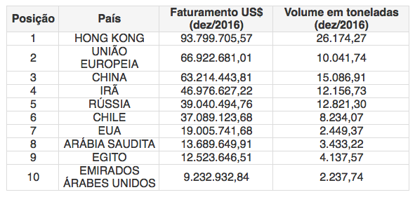 Se considerado somente o mês de dezembro de 2016, o faturamento das exportações de carne bovina brasileira registrou US$ 455 milhões em vendas externas, um aumento de 7,4% em relação a novembro de 2016. Já em volume embarcado, foram 113,4 mil toneladas, com crescimento de 13,8% se comparado com o mês anterior.