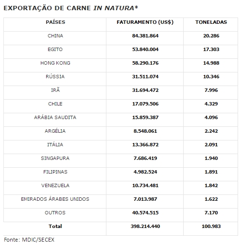 Segundo dados divulgados ontem (01), pela Secretaria de Comércio Exterior (Secex), somente na categoria de carne in natura, o Brasil exportou 100 mil toneladas, com faturamento de US$ 398 milhões.