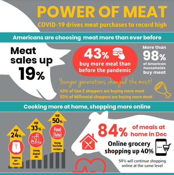 Os americanos estão comprando mais carne bovina, suína, de aves e cordeiros do que nunca com o aumento do tempo que passam em casa durante a pandemia; isso fez com que as vendas de carne no mercado crescessem cerca de 20% em 2020, comparado a 2019.