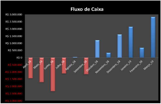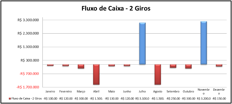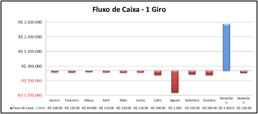 A partir dessa distribuição geramos, logo abaixo, um segundo gráfico, do demonstrativo de fluxo de caixa do nosso case. Observe que nos primeiros meses do ano as saídas de capital superam as entradas devido à aquisição de bois magros e insumos, e que não ocorre a venda de bois gordos.