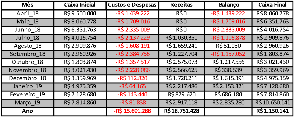 Para atingirmos a meta de lucro definida lá atrás, no orçamento, de R$ 209/cab ou R$ 1.150.141 após o abate de 5.500 cabeças no ciclo operacional 2018/2019 precisamos de um caixa inicial de R$ 9,5 milhões (sendo R$ 8 milhões de custeio e R$ 1,5 milhão de capital de giro).