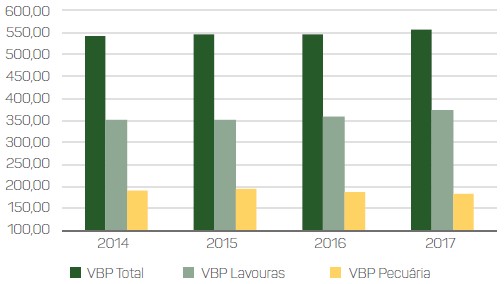 A pecuária tem, historicamente, uma representatividade menor que as lavouras no valor bruto de produção (VPB) total da agricultura (figura 1).
