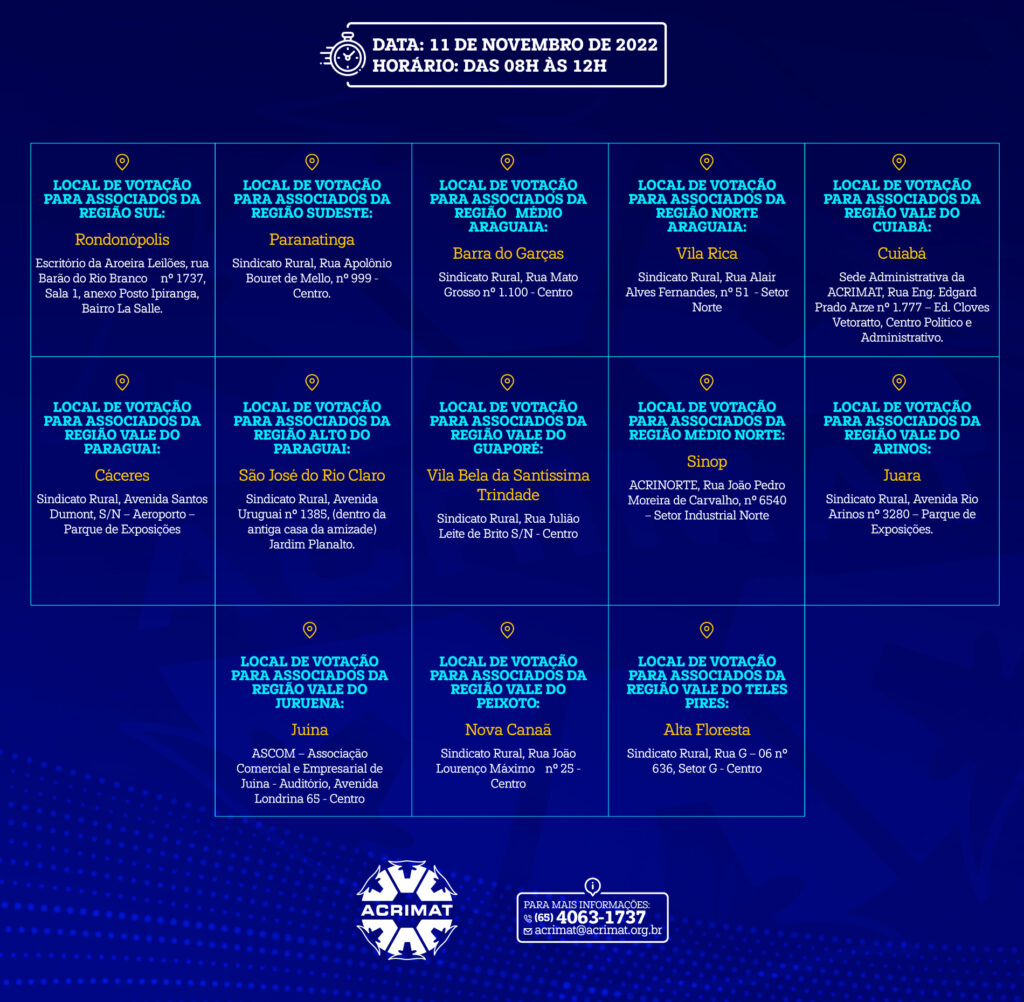 Confira outras informações sobre a eleição e os locais de votação de cada regional: https://acompanheseuprojeto.com.br/acrimat/eleicoes-2022/