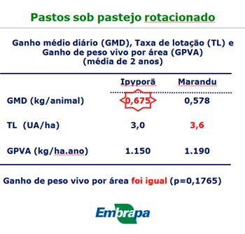 “A taxa de lotação do marandu é maior e ele cresce mais que a ipyporã, porém o híbrido tem mais qualidade nutricional, a taxa de digestibilidade é alta e consegue-se melhor performance no ganho médio diário. A taxa de lotação do marandu é compensada pelo ganho de peso da ipyporã”, analisa Valéria Pacheco, especialista em manejo de pastagem.