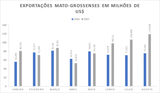 As exportações de carne em Mato Grosso registraram aumento de 58% em agosto deste ano em comparação com igual período do ano passado. De acordo com dados do Ministério do Desenvolvimento, Indústria e Comércio (Mdic), US$ 119,328 milhões foram movimentados no último mês, ante US$ 75,426 milhões em agosto de 2016. As receitas decorrem dos embarques de 27.105 toneladas e de 16.993 toneladas de carne bovina, respectivamente. No ano, as exportações somaram US$ 692,646 milhões.