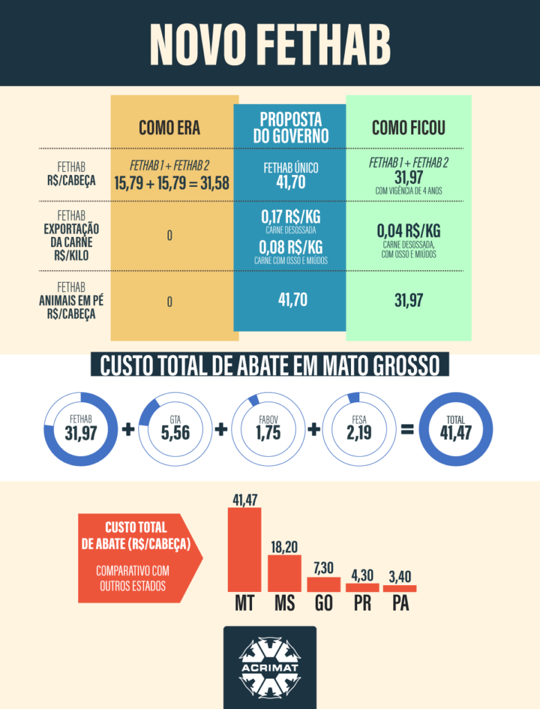 Antes da aprovação do projeto de lei, os pecuaristas contribuíram com R$ 31,58 entre Fethab 1 e Fethab 2 (considerando o valor da Unidade Padrão Fiscal (UPF) de janeiro). Agora, o produtor terá que desembolsar, R$ 31,97, somando isso as demais contribuições, como: o Guia de Transporte Animal (GTA) R$ 5,56; Fundo de Apoio ao Desenvolvimento da Bovinocultura (FABOV) R$ 1,75 e o Fundo Emergencial de Saúde Animal (FESA) R$ 2,19 , o custo total por animal abatido, passa a ser de R$ 41,47, (levando em conta o atual valor da UPF) o que, de acordo com a Associação dos Criadores do Mato Grosso (Acrimat), irá comprometer em mais de 40% a margem de lucro na atividade.