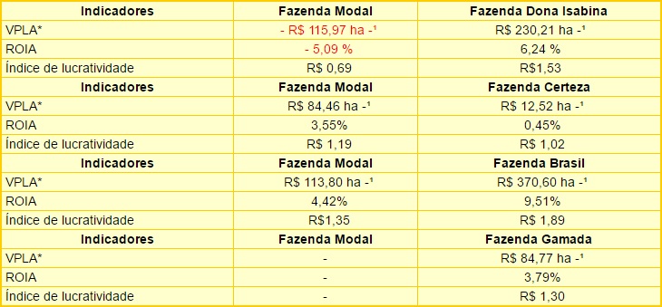 Resultados – Três desses indicadores exemplificam bem os resultados. Um é o valor presente líquido anual (VPLA), que faz uma comparação do fluxo de custos e receitas ao longo do tempo, traz os valores para o momento inicial do sistema e mostra a rentabilidade por ano. Outro indicador é o índice de lucratividade, que apresenta o lucro ou prejuízo para cada R$ 1 investido. O terceiro indicador é o retorno sobre investimento anualizado (ROIA), que é uma transformação percentual do índice de lucratividade.