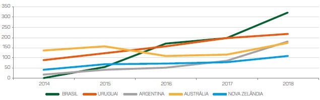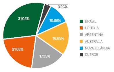 Em terceiro lugar aparece a Argentina com 180,37 mil toneladas, em seguida temos a Austrália e ocupando a quinta posição, a Nova Zelândia.