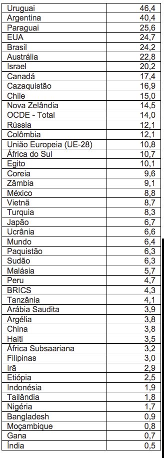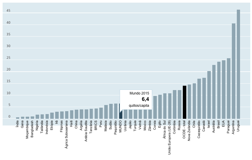 Confira abaixo o indicador da Organização para Cooperação e Desenvolvimento Econômico (OCDE) para consumo de carne bovina e de vitelo. O consumo é medido em mil toneladas de peso carcaça e em quilos de peso no varejo per capita. O fator de conversão de peso carcaça para peso varejo é de 0,7.