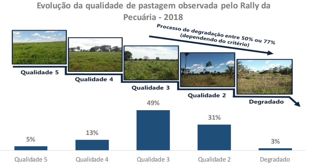 As pastagens continuam sendo um gargalo importante da pecuária. É o que mostram dados do Rally da Pecuária. Nas análises, dependendo do critério adotado, de 50% a 77% das áreas de pasto do público da expedição estão em processo de degradação. A porcentagem de pastagem considerada degradada se manteve estável, em 3%, mesmo com a adoção de uma metodologia de avaliação mais rigorosa. “Consideramos degradado o pasto que não tem mais capim, que a população de planta por metro quadrado é insuficiente. Se for controlar invasoras não vai sobrar pasto e se adubar o que vai produzir não vai ser pasto; tem que reformar”, explica Maurício Palma Nogueira, sócio-diretor da Athenagro e coordenador do Rally.