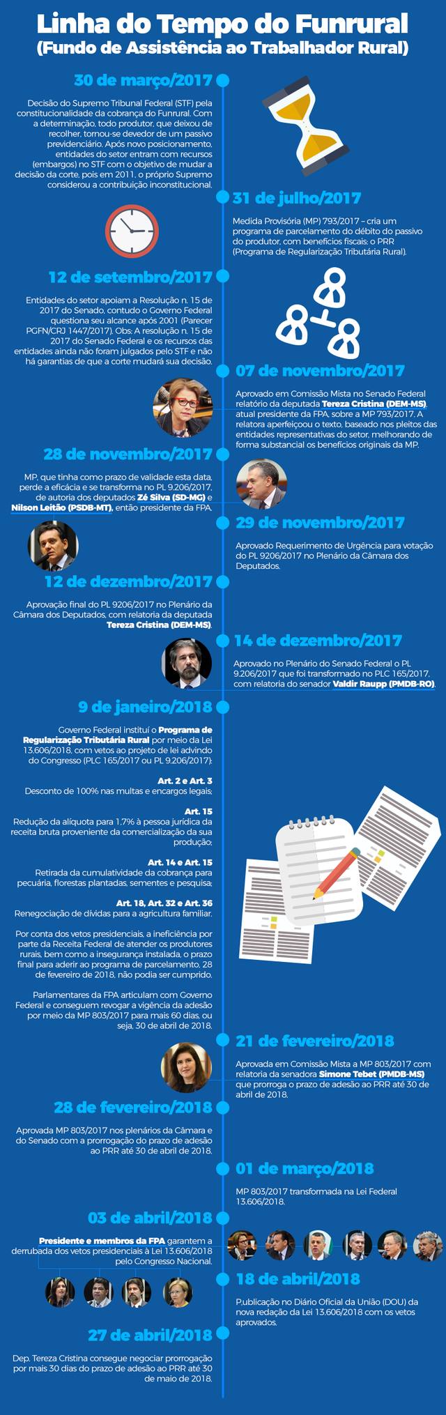 O primeiro se refere à votação do projeto de lei 9623/2018, de autoria da deputada Tereza Cristina, que revoga o bloqueio de bens pela Procuradoria-Geral da Fazenda Nacional, em caso de o devedor tributário não quitar seu débito em até cinco dias. O segundo (PL 9252/2017) é de autoria do deputado Jerônimo Goergen (PP-RS), coordenador de Infraestrutura e Logística da FPA, e pede o fim da cobrança do passivo do Funrural, referente ao período 2010-2017.