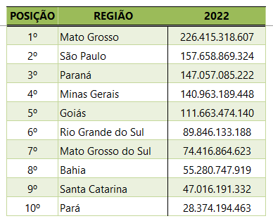 Mato Grosso se mantém como o principal polo brasileiro de produção agropecuária, de acordo com a estimativa do Valor Bruto da Produção Agropecuária (VBP) de 2022, divulgada pelo Ministério da Agricultura, Pecuária e Abastecimento (Mapa) nesta semana.